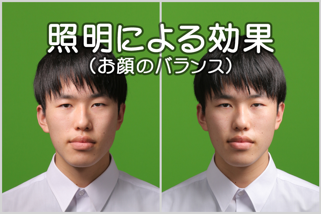 上記は、写真は照明の当て方の違いによる比較画像です。右の写真は左目が小さいのが目立ちます。左の写真は右と比べてその差がわかりにくくなっています。照明の当て方で、目の大きさの違いが緩和されたり、輪郭がシャープに見えたりするなど補正します。場合によっては、業種・職種を伺って、キリッと見える・柔らかい印象になるなどの違いで照明を使い分けることもあります。