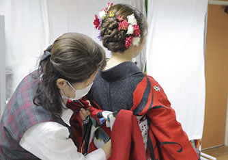 流行のヘアセットができる美容師さんは多くいますが、着付けができる方は近年減少傾向にあり、成人式ではとても重宝されます。着付けは、見様見真似でできるものでも、10分15分でパパッと仕上がるものでもありません。着付けをする人によっては、体型に合わせてではなくマニュアル通りに補正タオルを何枚も入れたり、紐や帯の締め方がゆるかったり、襟元が浮いて整っていなかったり・・・その仕上がりは様々。今までたくさんのお客様を見てきましたが、撮影前にできる範囲でお直しをさせていただいた方も少なくありません。美しい着付け・着崩れにくい着付けをするとなれば、確実に技術や経験がものをいい、できる人材はさらに限られます。ちなみに、光栄写真館での着付けは、経験豊富な資格所有者が行っていますのでご安心ください。