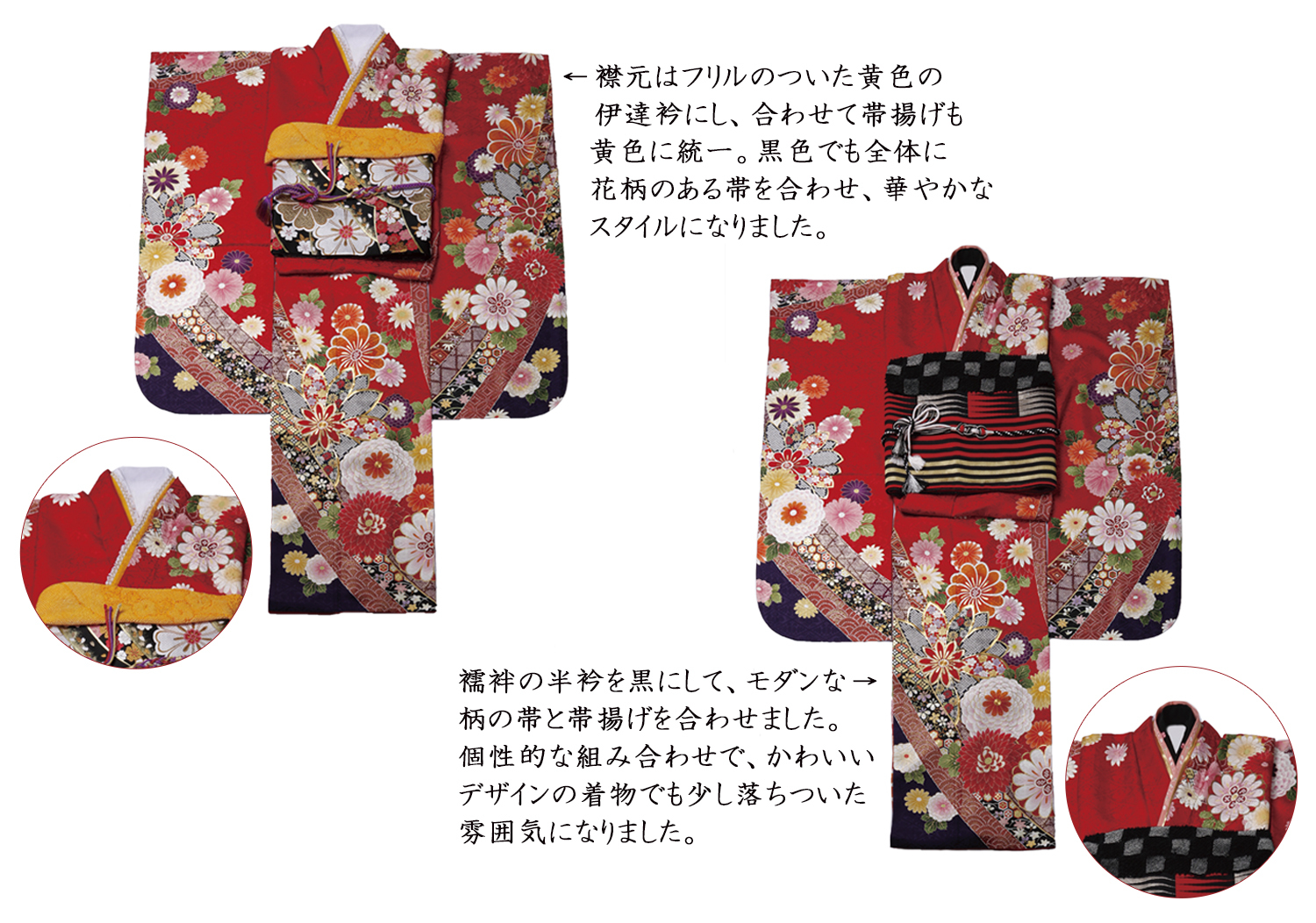 光栄写真館は、写真だけではないんですよ。レンタル振袖もご用意があります。振袖だけでなく帯や小物も充実の品揃え。そして何より、選ぶ帯や小物によっての追加料金が一切ありません!王道デザインでも新作デザインでも、ベースとなる振袖が決まったら、あとは帯や小物、ショールまで基本料金の中でお好みのスタイルを自由にお作りいただくことができます。下の写真のように、同じ着物でも小物使いで随分と雰囲気が変わるものです。あなたなら、どんなコーディネートにしますか?