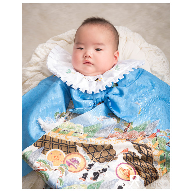 一般的には、白のベビードレスやロンパースなどを着用して掛け着をまとうスタイルです。正式とされていた白羽二重という白絹の服装は高額な上に、成長してすぐ着られなくなるためあまり利用されていません。